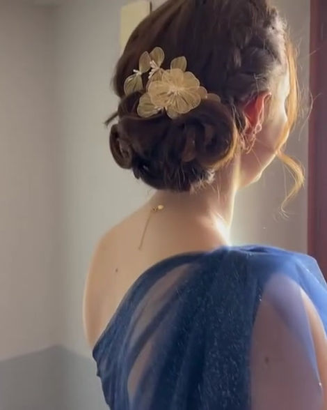 Le haut ajusté met en valeur sa silhouette avec élégance, tandis que les manches en tulle brodé ajoutent une légèreté aérienne qui dévoile subtilement sa peau. La jupe ample en tulle, prolongée d’une traîne de 1,5 mètre, offre à Nolwenn une allure majestueuse et gracieuse, parfaite pour captiver tous les regards.
